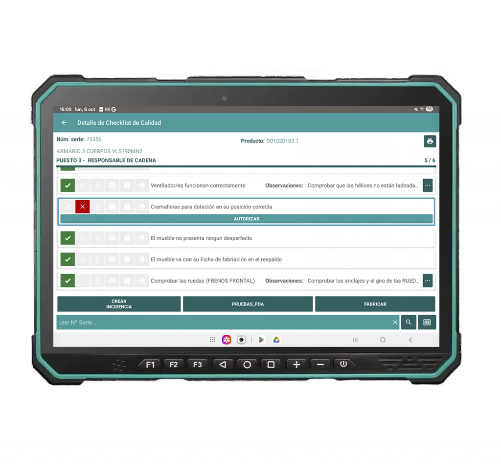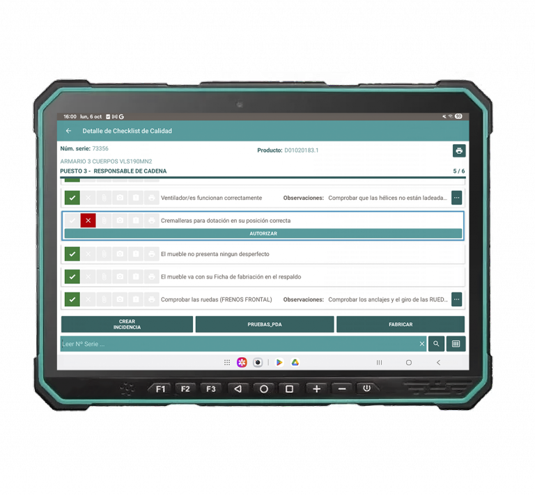 El módulo de Calidad de OpenTabs ERP está pensado para un uso 100% móvil. Los operarios y responsables pueden ejecutar checklists de inspección, registrar incidencias o validar controles desde dispositivos convencionales o industriales, sin necesidad de papeleo ni desplazamientos innecesarios.