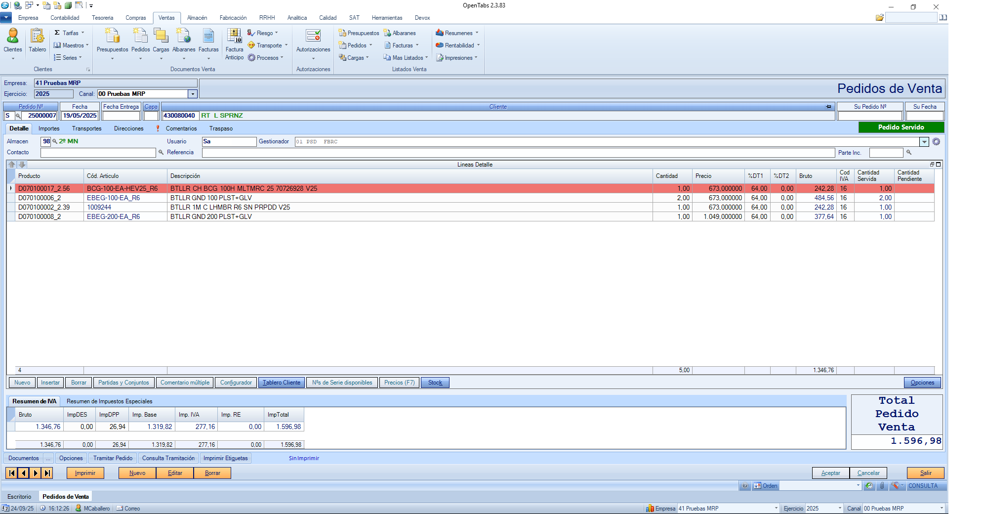 Cuando se registra un pedido de cliente, OpenTabs comprueba automáticamente si existe stock suficiente. Si no lo hay, se genera una necesidad de fabricación o una propuesta de compra para cumplir con los plazos. El sistema calcula fechas de entrega realistas basadas en la disponibilidad y capacidad de producción.